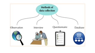 Data collection involves systematically gathering and analyzing information to answer research questions. There are two main types of data collection: primary and secondary. Primary data is collected directly by the researcher, and can involve qualitative methods like open-ended questionnaires or quantitative methods using closed-ended questions. Secondary data involves collecting existing information from sources like published literature. Common primary collection methods include observation, interviews, questionnaires, and databases.