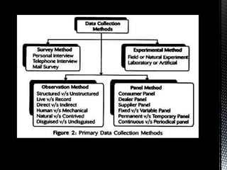 This document discusses various methods for collecting primary data, including surveys, interviews, telephone surveys, mail surveys, observation, and experiments. It provides details on each method, such as how surveys involve asking questions of respondents, interviews can be personal or focus groups, telephone surveys are conducted by phone, and mail surveys are done through postal mail. It also discusses challenges with each method like response rates for mail surveys and controlling external factors for experiments.