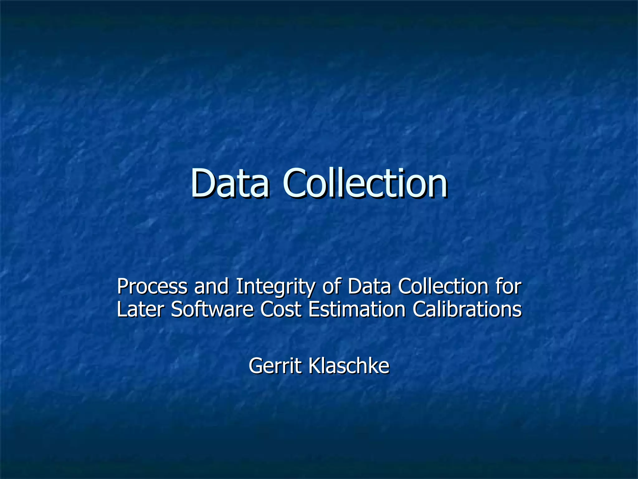 The document discusses best practices for collecting software project data including defining a process for collection, storage, and review of data to ensure integrity. It emphasizes personally interacting with data sources to clarify information, establishing a central repository, and normalizing data for later analysis and calibration of estimation models. The checklist provides guidance on reviewing various aspects of the data collection to validate completeness and accuracy.
