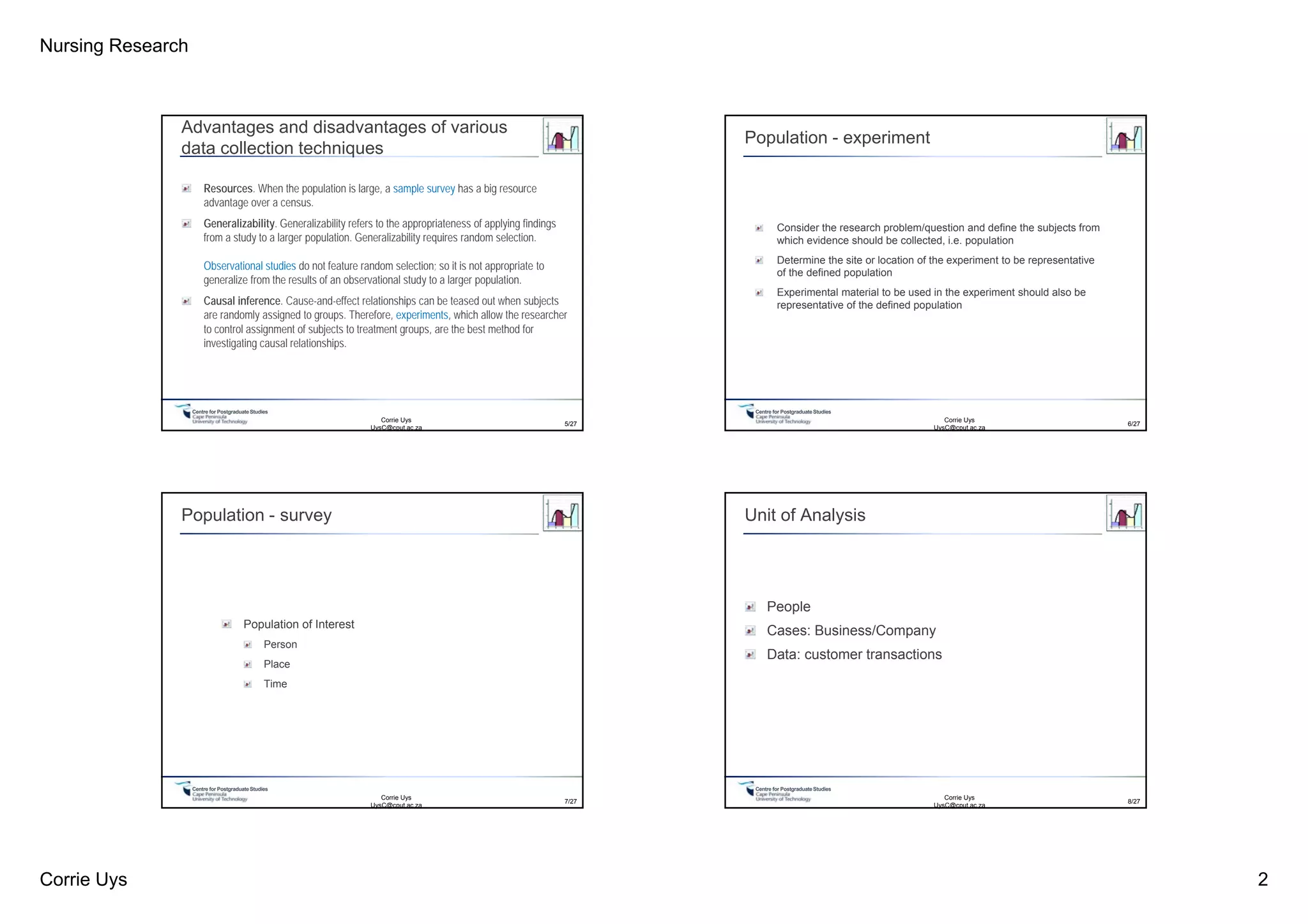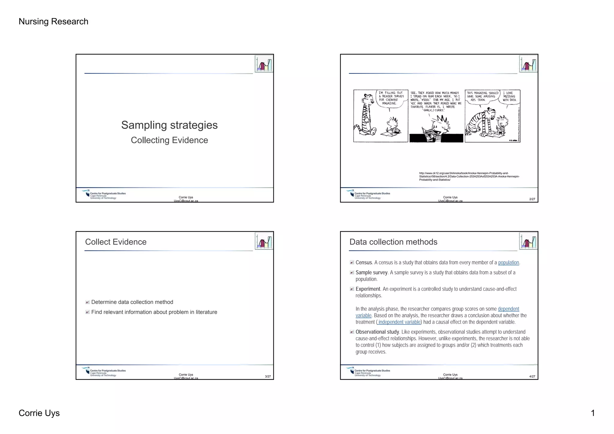This document discusses various methods for collecting data and sampling strategies in nursing research. It begins by defining key terms like census, sample survey, experiment, and observational study as different data collection methods. It then covers advantages and disadvantages of these methods. The document primarily focuses on explaining different sampling strategies, including probability and non-probability techniques. It discusses considerations for calculating appropriate sample sizes and provides an example of a sample size calculation. Overall, the document provides an overview of collecting evidence and sampling in nursing research.