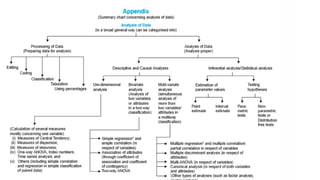 This document discusses data collection, tabulation, processing, and analysis. It begins by outlining the need for data collection to support scientific research and problem solving. It then describes various methods of data collection including warranty cards, audits, and mechanical devices. The document emphasizes the importance of processing and analyzing raw data to make it meaningful and test hypotheses. It outlines steps in processing like editing, coding, classification, and tabulation. Finally, it discusses various statistical analysis techniques including measures of central tendency, frequency distributions, correlation, regression, and parametric and non-parametric tests.