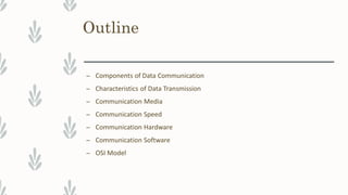 The document provides a comprehensive overview of data communication, detailing its components, characteristics, media, hardware, and software. It discusses the roles of messages, senders, receivers, and protocols, along with types of data transmission modes and directions. Additionally, it explains the OSI model's layers, emphasizing the importance of communication hardware and software in facilitating data transfer.