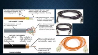 Data communication involves the transmission of electronic data between nodes through a communication medium. There are several fundamental principles and basic elements of a communication system. The principles include delivery of data to the correct destination, accuracy of the data, and timely delivery. The basic elements are the message, sender, medium, receiver, and protocols. Common wired media include twisted pair cable, coaxial cable, and fiber optic cable. Wireless media include Bluetooth, Wi-Fi, and cellular networks. Protocols like TCP/IP govern how devices communicate by handling delivery and addressing. Data can be transmitted in analog or digital form.