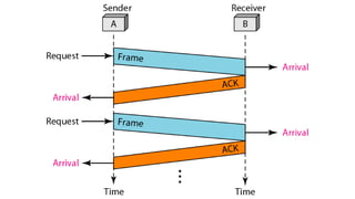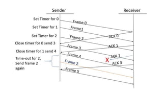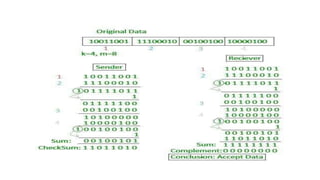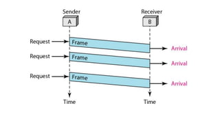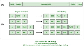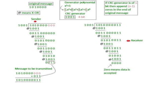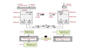 The document provides an in-depth overview of the data link layer in networking, detailing its design issues, elementary protocols, and functionalities such as framing, error detection, and correction. It describes the two sub-layers of the data link layer, logical link control (LLC) and media access control (MAC), along with various services provided, frame synchronization methods, and types of error detection techniques like parity checks and cyclic redundancy checks. Additionally, it discusses error correction methods, including Hamming codes, to ensure reliable data transmission over networks.