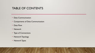 The document provides an overview of data communication and networking concepts, including components of data communication, data flow types, network types, protocols, and the OSI model. It explains different network topologies such as bus, ring, star, and mesh, along with their advantages and disadvantages. Additionally, the document covers various protocols like TCP, IP, and SMTP, which facilitate data transmission and communication between devices.