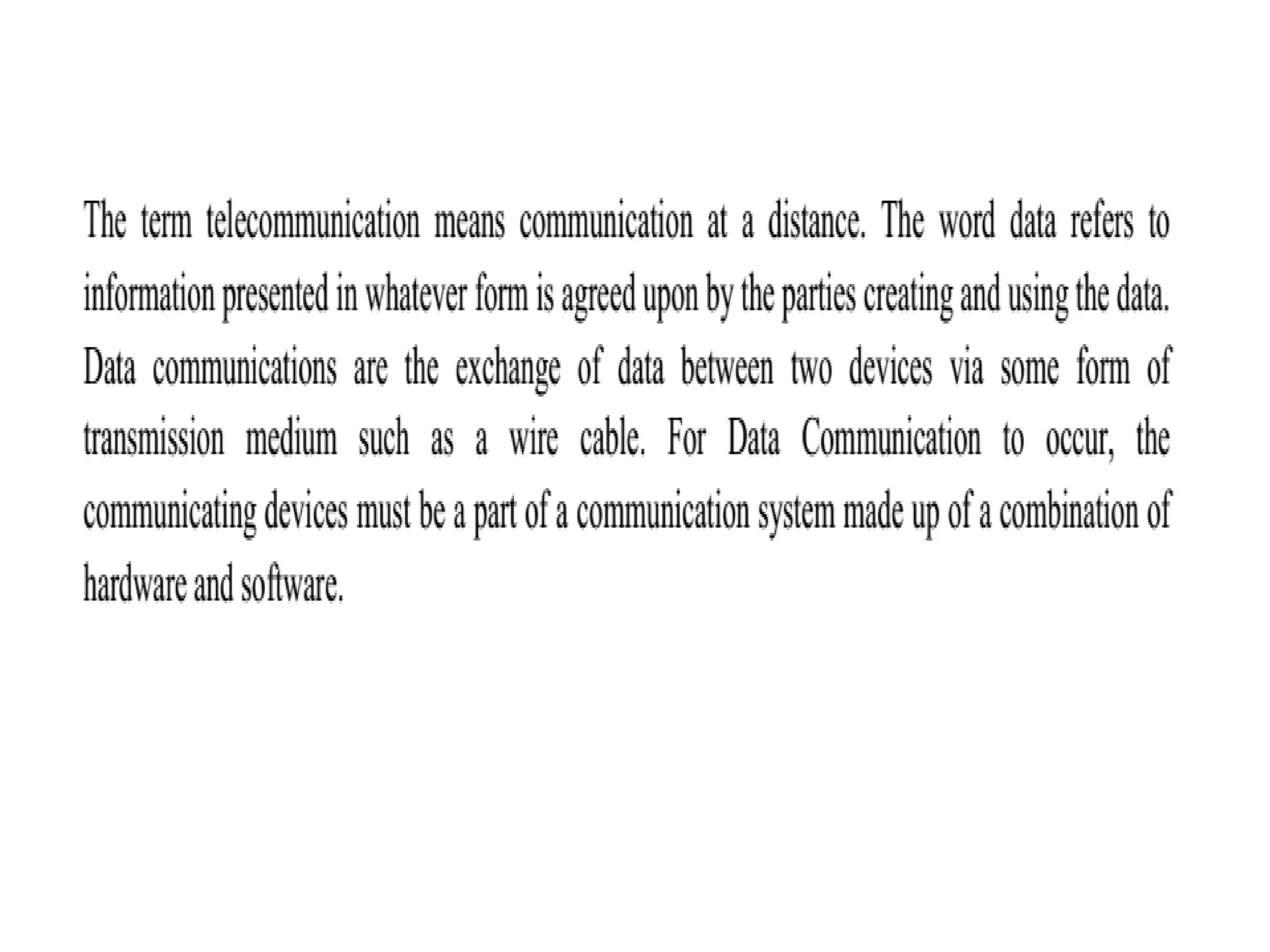 Similar to Data communication refers to the exchange of digital or analog data between devices through a transmission medium. It involves various components and technologies to ensure efficient and reliable data transfer. Here are some key aspects: