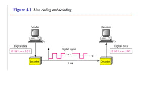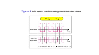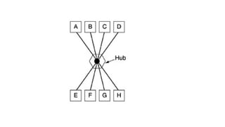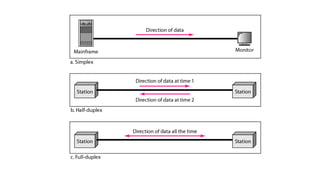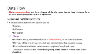The document discusses physical layer data flow and various modes of communication between devices, including simplex, half-duplex, and full-duplex. It describes different topologies (mesh, star, bus, ring) and their advantages and disadvantages, as well as concepts like repeaters, hubs, bandwidth, throughput, latency, and the importance of the bandwidth-delay product in networking. Key aspects of performance, including the limits of transmission quality and the significance of network design in data communications, are also highlighted.