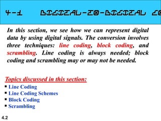 This document discusses digital transmission techniques for converting digital data into digital signals. It covers line coding, which maps binary data bits to signal levels. Common line coding schemes include NRZ, RZ, Manchester, and AMI. Multilevel coding schemes are also introduced, which encode multiple data bits as a single signal element to increase data rates. Key considerations for line coding include baseline wandering, DC components, self-synchronization, error detection, noise immunity, and complexity. Worked examples calculate baud rates and minimum bandwidths for different schemes.