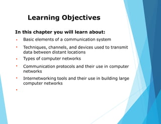 This document provides an overview of data communications and computer networks. It discusses the basic elements of a communication system including senders, receivers, and transmission media. It then describes different types of transmission media such as twisted pair wire, coaxial cable, microwave systems, and optical fibers. The document also covers digital and analog data transmission, network topologies including star, ring, bus and hybrid networks. It defines local and wide area networks and describes some common networking devices like network interface cards.