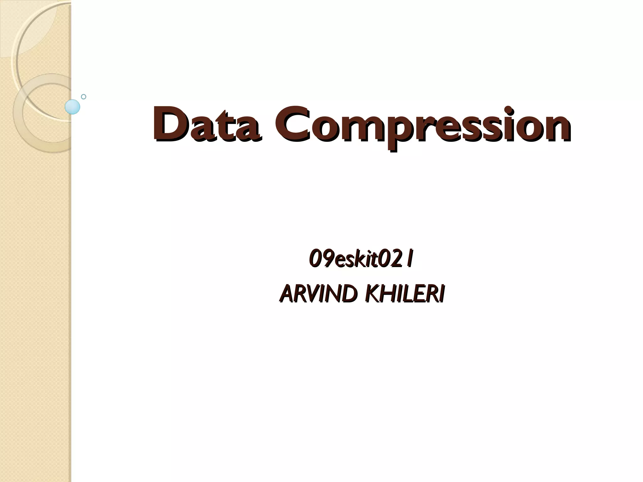 This document discusses various data compression techniques. It begins by explaining why data compression is useful for optimizing storage space and transmission times. It then covers the concepts of entropy and lossless versus lossy compression methods. Specific lossless methods discussed include run-length encoding, Huffman coding, and Lempel-Ziv encoding. Lossy methods covered are JPEG for images, MPEG for video, and MP3 for audio. Key steps of each technique are outlined at a high level.
