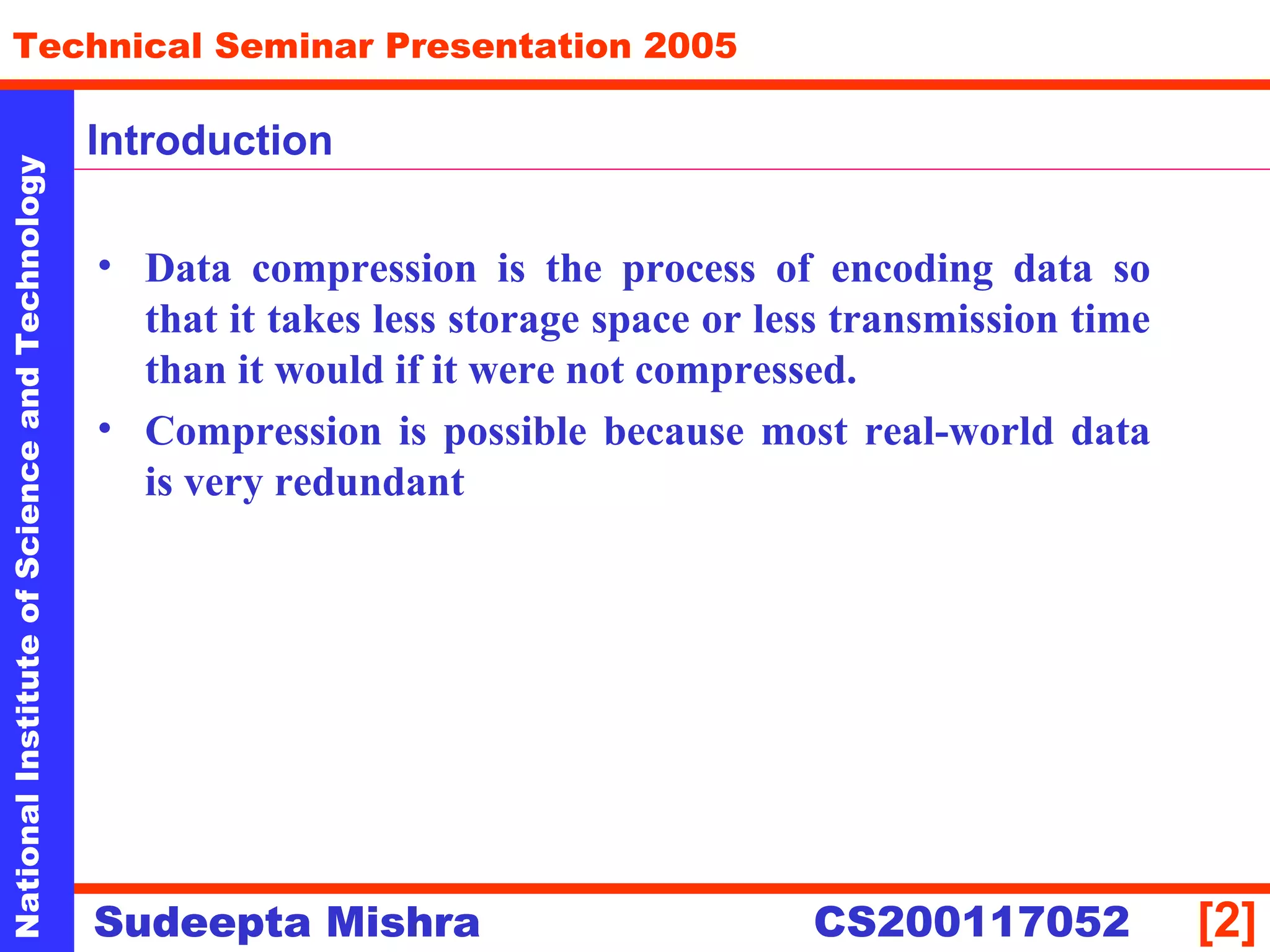 Sudeepta Mishra gave a technical seminar presentation on data compression techniques. They discussed lossless compression techniques like dictionary coders, entropy encoding, and run-length encoding. They focused on the LZW compression algorithm, providing examples of how it works for both compression and decompression. LZW is an adaptive dictionary coding technique that builds the dictionary dynamically and does not require transmitting the dictionary.