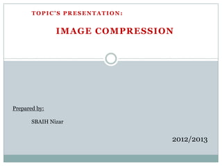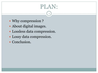 This document summarizes image compression techniques. It discusses why images need to be compressed to reduce file sizes and speed up transmission. It describes how digital images are composed of pixels and color components. The document then covers lossless compression algorithms like Run Length Encoding (RLE) and LZW, which use statistical redundancy or dictionaries to compress images without loss of information. It also mentions lossy compression techniques like quantization that can achieve higher compression ratios but result in some loss of visual quality.
