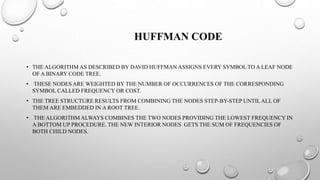 This document discusses various data compression techniques including Huffman coding, adaptive Huffman coding, arithmetic coding, statistical and adaptive algorithms, and dictionary modeling. It provides details on how each technique works, such as assigning codes based on symbol frequencies for Huffman coding, adapting the code tree for adaptive Huffman coding, and dividing the numeric range based on symbol probabilities for arithmetic coding. It also discusses calculating entropy, the adaptive character word length algorithm, overhead considerations, and how dictionary-based algorithms encode variable-length strings as tokens.
