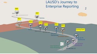 1. LAUSD has been developing its enterprise data and reporting capabilities since 2000, with various systems and dashboards launched over the years to provide different types of data and reporting, including student outcomes and achievement reports, individual student records, and teacher/staff data.