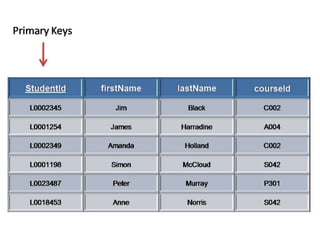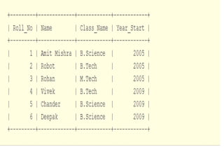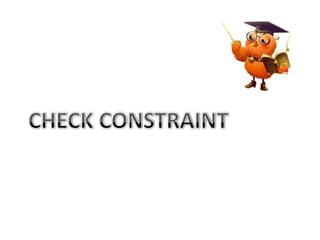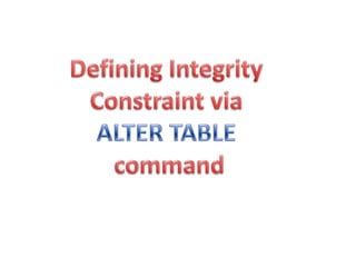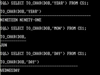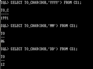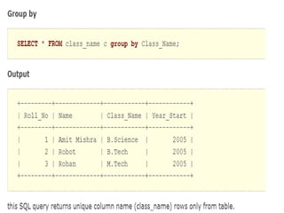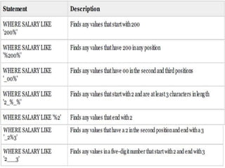 The document provides information on various database management systems (DBMS), data definition language (DDL) constraints, and SQL queries. It lists popular DBMS like MySQL, Oracle, SQL Server and their owners. It then describes key database constraints - primary key, foreign key, unique, check, and NOT NULL. It provides examples of creating tables with these constraints. The document also covers SQL queries using logical operators, aggregate functions, date manipulation, pattern matching, subqueries and more.