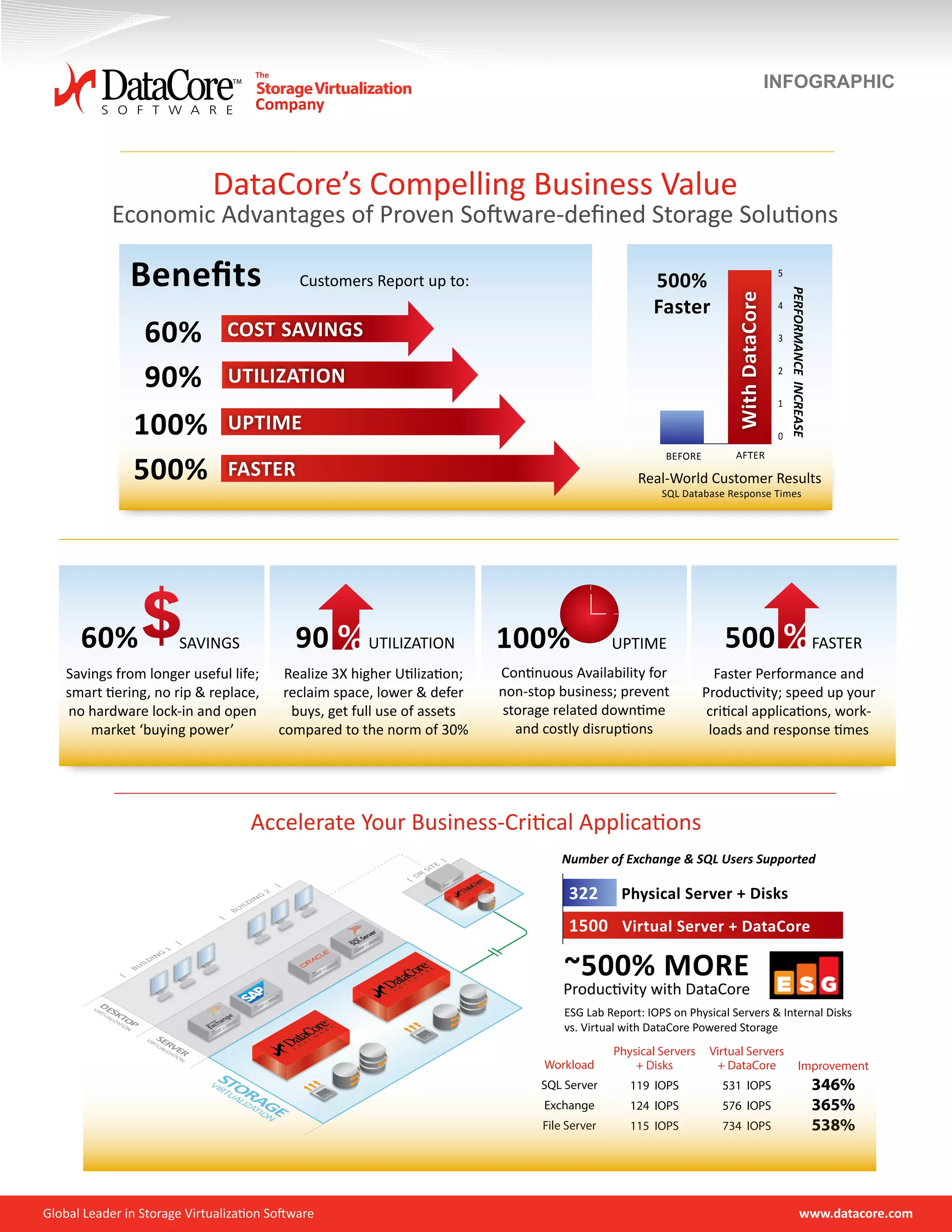 DataCore software can significantly improve performance of virtual servers running SQL Server, Exchange, and file server workloads compared to physical servers with direct-attached storage. Using DataCore, these workloads saw performance increases of 346-538% in IOPS. DataCore also allows customers to achieve up to 500% faster performance, 90% utilization rates, 100% uptime, and 60% cost savings.