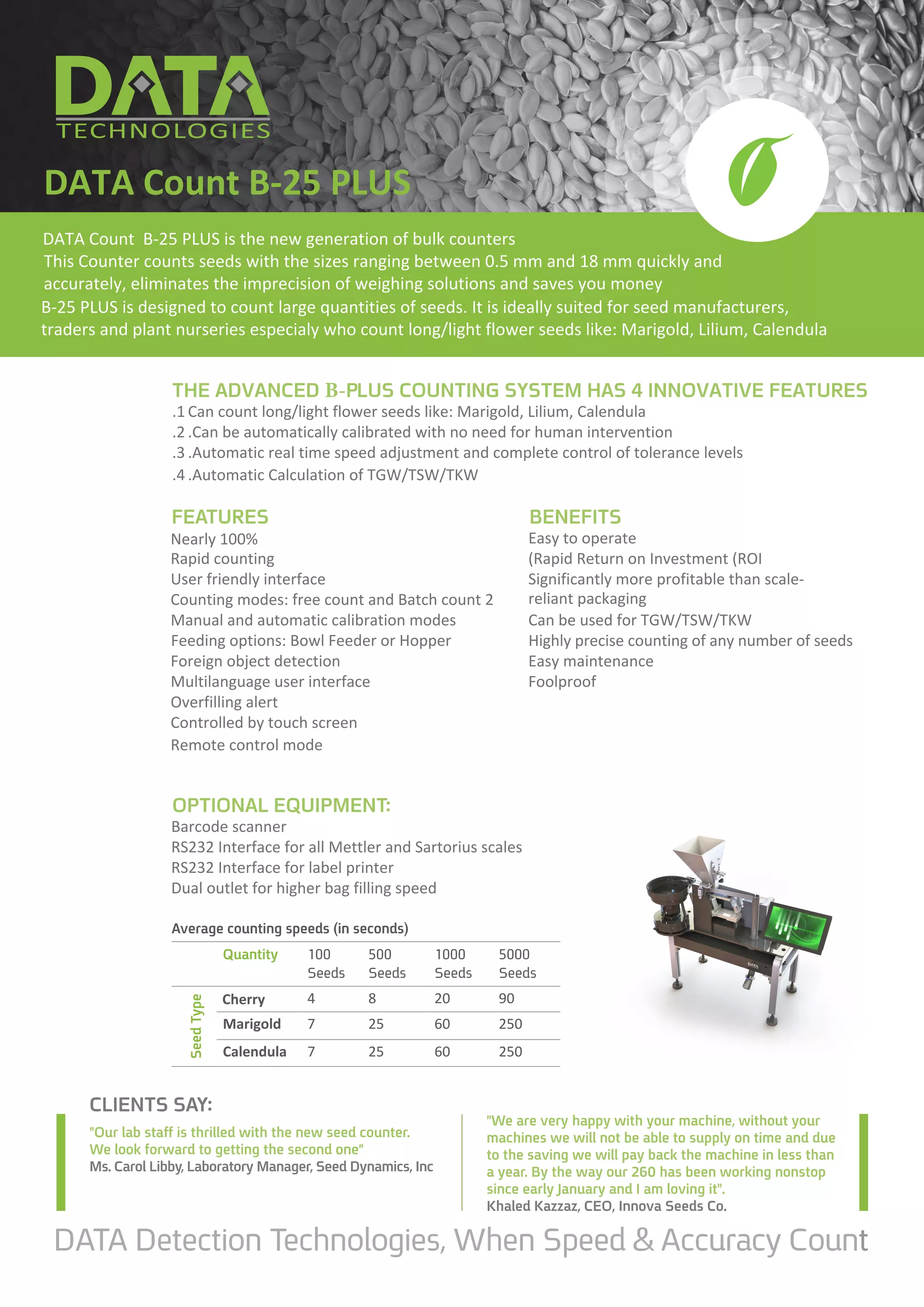 The advanced b-plus counting system is designed to accurately count small flower seeds and offers features such as automatic calibration, real-time speed adjustment, and tolerance control. It is user-friendly, highly precise, and provides a rapid return on investment, leading to positive feedback from clients in the seed industry. The machine is suitable for large quantities and eliminates the inaccuracies of traditional weighing methods.