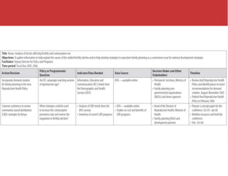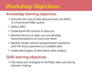 This document provides an overview of a workshop on data demand and use. The workshop objectives are to develop a framework for linking data with action, create an action plan for overcoming barriers to data use and improving information flow, and establish three commitments to improve data use in participants' jobs. The workshop covers various monitoring and evaluation concepts like results chains, indicators, baselines, and targets. It also discusses data demand and use, the context of decision making, barriers to data use, and descriptive data analysis techniques like service delivery analysis and unit cost analysis. Participants will learn a seven-step process for using information to make data-informed decisions.
