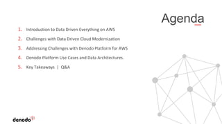 The document discusses challenges with data-driven cloud modernization and how the Denodo platform can help address them. It outlines Denodo's capabilities like universal connectivity, data services APIs, security and governance features. Example use cases are presented around real-time analytics, centralized access control and transitioning to the cloud. Key benefits of the Denodo data virtualization approach are that it provides a logical view of data across sources and enables self-service analytics while reducing costs and IT dependencies.