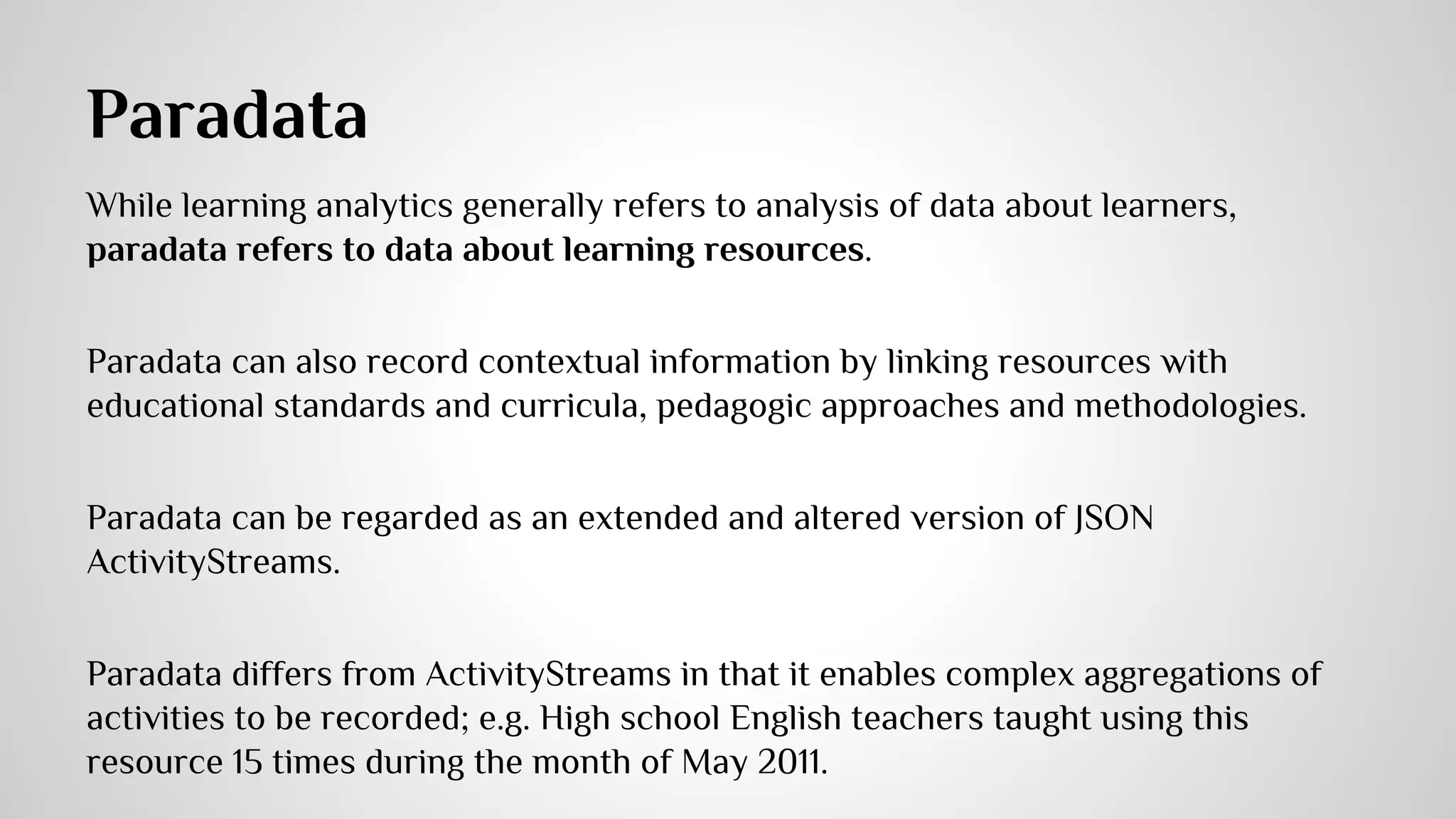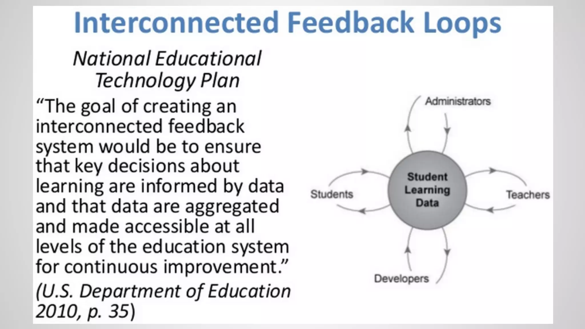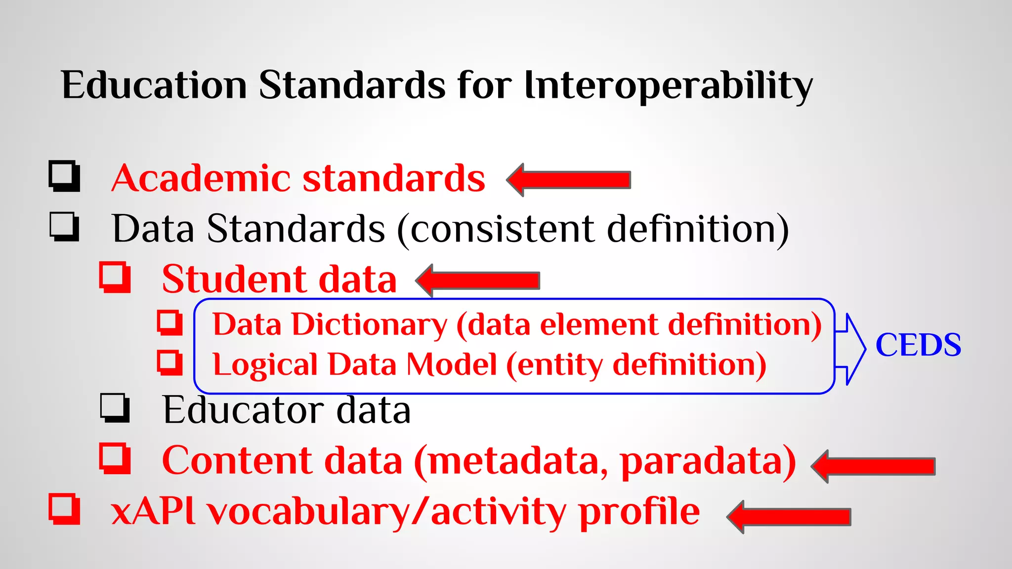 The document outlines a data-driven learning strategy emphasizing the importance of big data in enhancing educational practices and personalized learning experiences. It highlights the need for improved evidence frameworks to analyze diverse and granular educational data from digital learning systems, alongside collaborative efforts between researchers and educational institutions. Additionally, it discusses the role of technologies like xAPI in tracking learning activities and the importance of community-driven standards for effective data interoperability in educational settings.