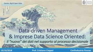 Il documento discute l'importanza del data-driven management e delle aziende orientate alla data science nel processo decisionale. Presenta le modalità per integrare i big data nelle decisioni aziendali, evidenziando il valore dell'analisi dei dati e del reclutamento di esperti per sfruttare al massimo le opportunità. Inoltre, analizza esempi pratici di applicazione dei big data in vari settori aziendali, come produzione, logistica e marketing.
