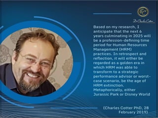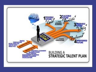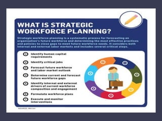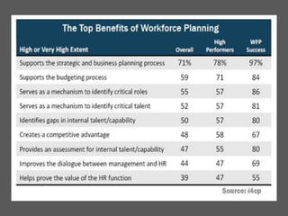 This document outlines a training program focused on data-driven strategic workforce planning and organization design, highlighting best practice principles and processes over two days. Key topics include diagnosing current HR practices, applying a six-step strategic HR planning process, organization design fundamentals, and metrics for talent management. It also emphasizes the importance of integrating HR strategies with business goals and fostering a proactive approach to workforce management.