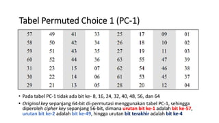 3. Proses enkripsi DES terdiri atas inisial permutasi, pemisahan plaintext, operasi XOR, S-box, dan permutasi akhir
