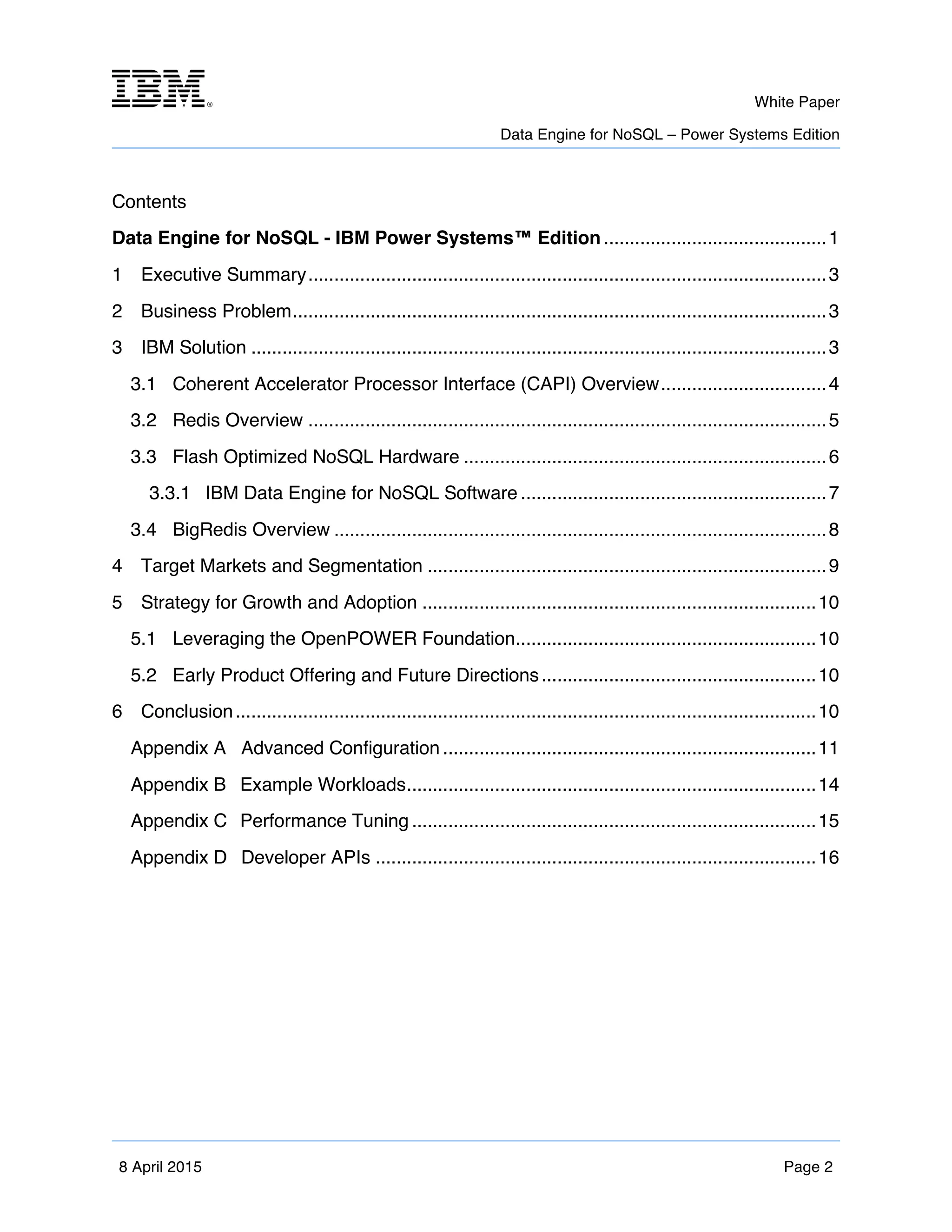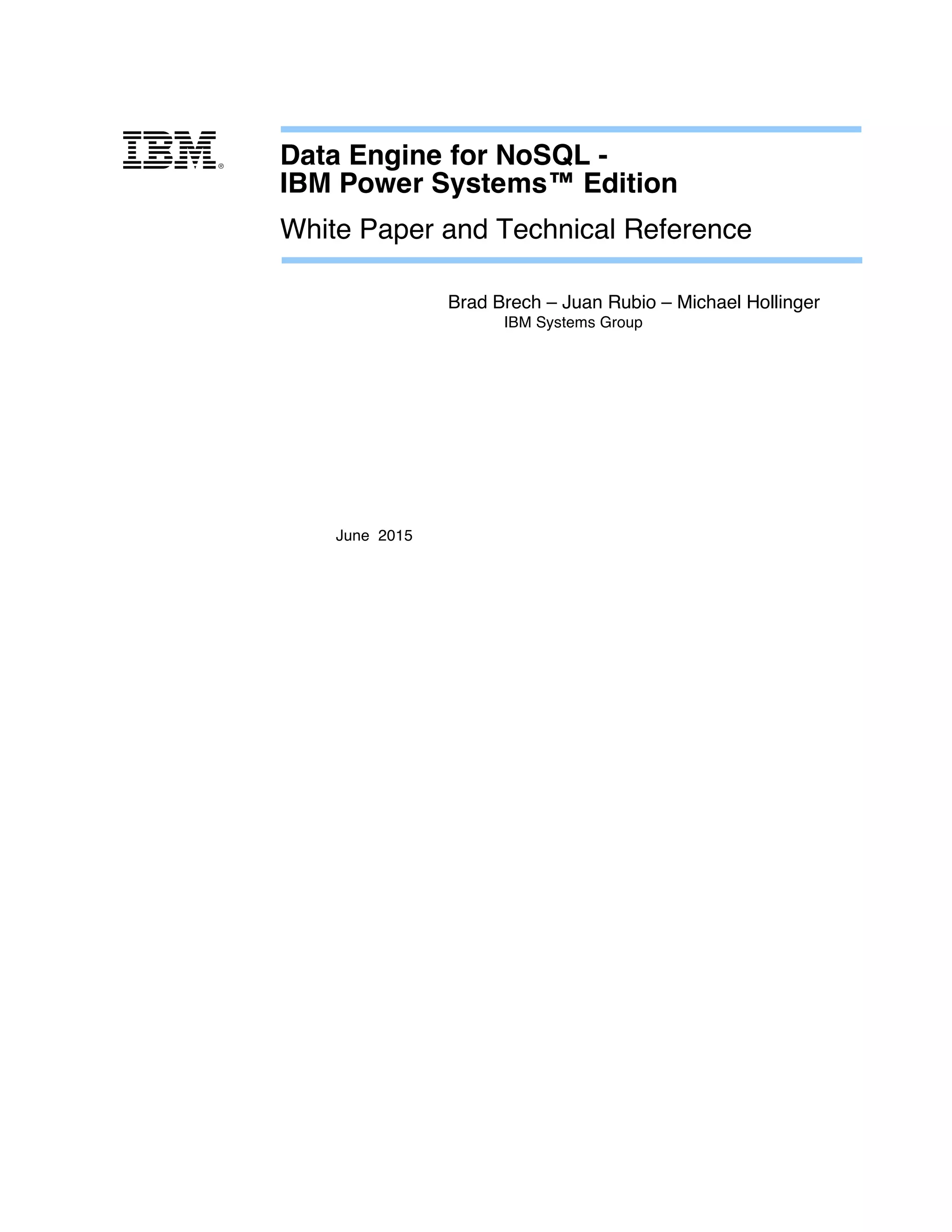 The document describes IBM's Data Engine for NoSQL solution for Power Systems. It leverages CAPI to attach flash memory to POWER8 processors, providing up to 57TB of flash as an alternative to expensive DRAM for NoSQL implementations like Redis. This reduces costs while providing sufficient performance for most applications. The solution includes software that provides APIs for applications to access the flash similarly to main memory.