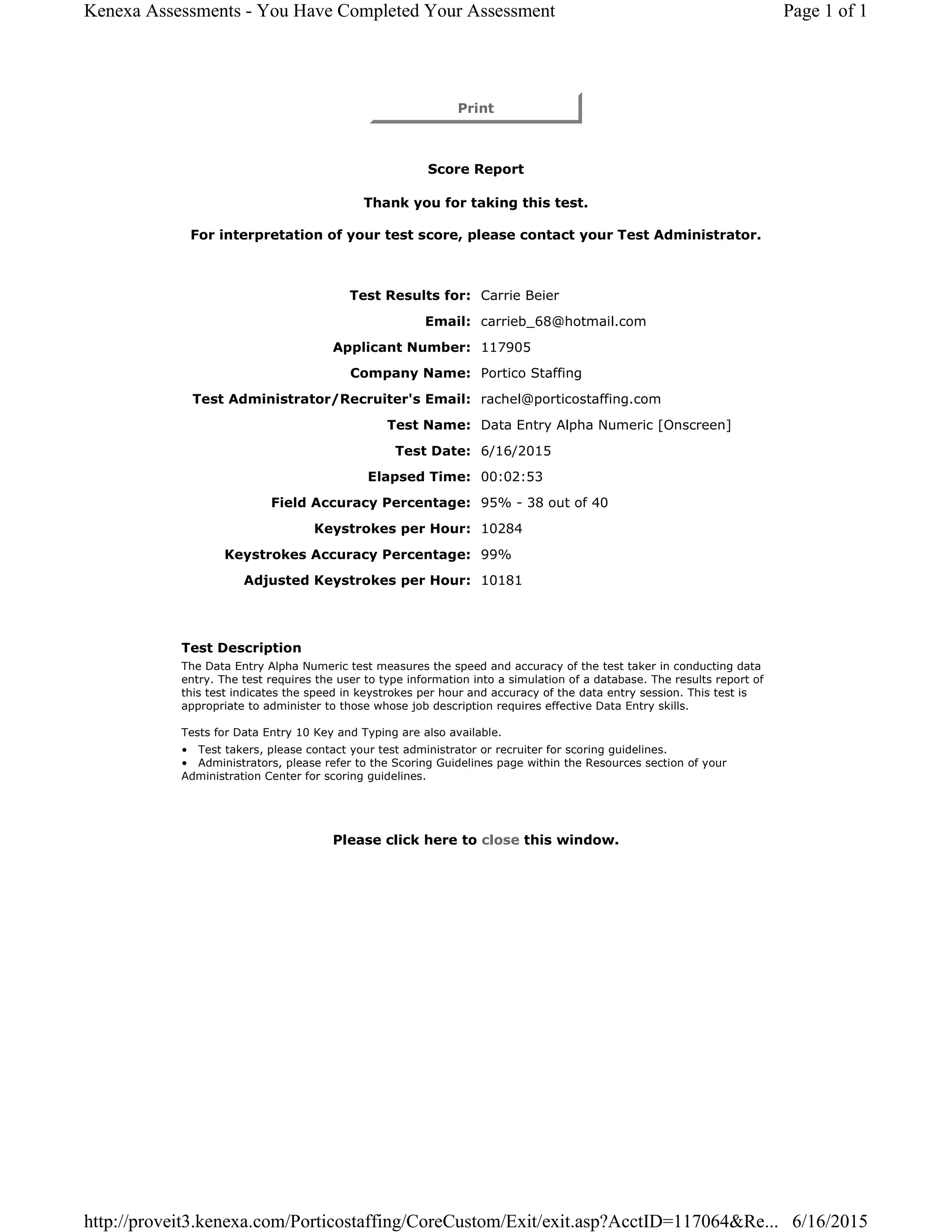 The test summary provides the applicant's test results for a data entry alphanumeric test taken on June 16, 2015. The applicant achieved a field accuracy percentage of 95% by entering 38 out of 40 entries correctly. Their keystrokes per hour was 10,284 with a 99% keystrokes accuracy percentage and an adjusted keystrokes per hour of 10,181. The test measures the speed and accuracy of data entry into a database simulation.