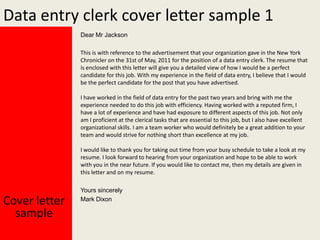This document provides materials to help write a cover letter for a data entry clerk position, including two sample cover letters. The samples letters highlight the applicant's data entry experience and skills like typing speed and familiarity with Microsoft Office. Both letters express interest in the position and availability to follow up by phone. Additional tips and resources are listed on writing cover letters, resumes, and preparing for interviews.
