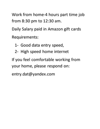 This part-time work from home job pays a daily salary in Amazon gift cards and requires working from 8:30 pm to 12:30 am doing data entry with a good entry speed and high-speed home internet. Interested candidates should respond to entry.dat@yandex.com.