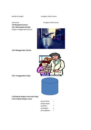 Dokumen tersebut memberikan informasi mengenai pengaturan format teks, tabel, diagram, dan grafik di Microsoft Excel. Beberapa fitur yang dijelaskan adalah mengisi data, mengatur font, letak tulisan, menyisipkan gambar, menggunakan rumus dan fungsi, membuat diagram dan grafik, serta latihan-latihan praktik menggunakan fitur-fitur tersebut.