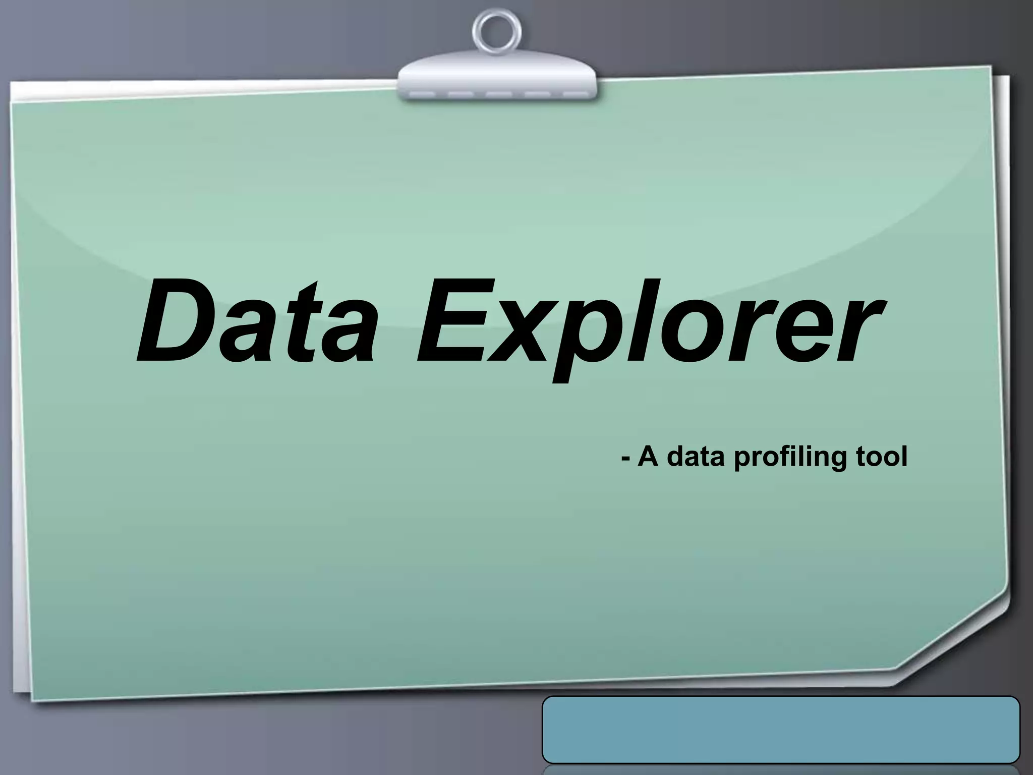This document outlines a proposed data profiling tool called Data Explorer. It discusses the need for data profiling, limitations of existing approaches, and provides details on the proposed solution. Key points include: Data Explorer will provide an easy to use interface for profiling multiple databases, support various profiling types like column, constant, and unique analysis, integrate data quality checking, and be developed using .NET with C# on Windows platforms. It aims to help users better understand data issues and quality.