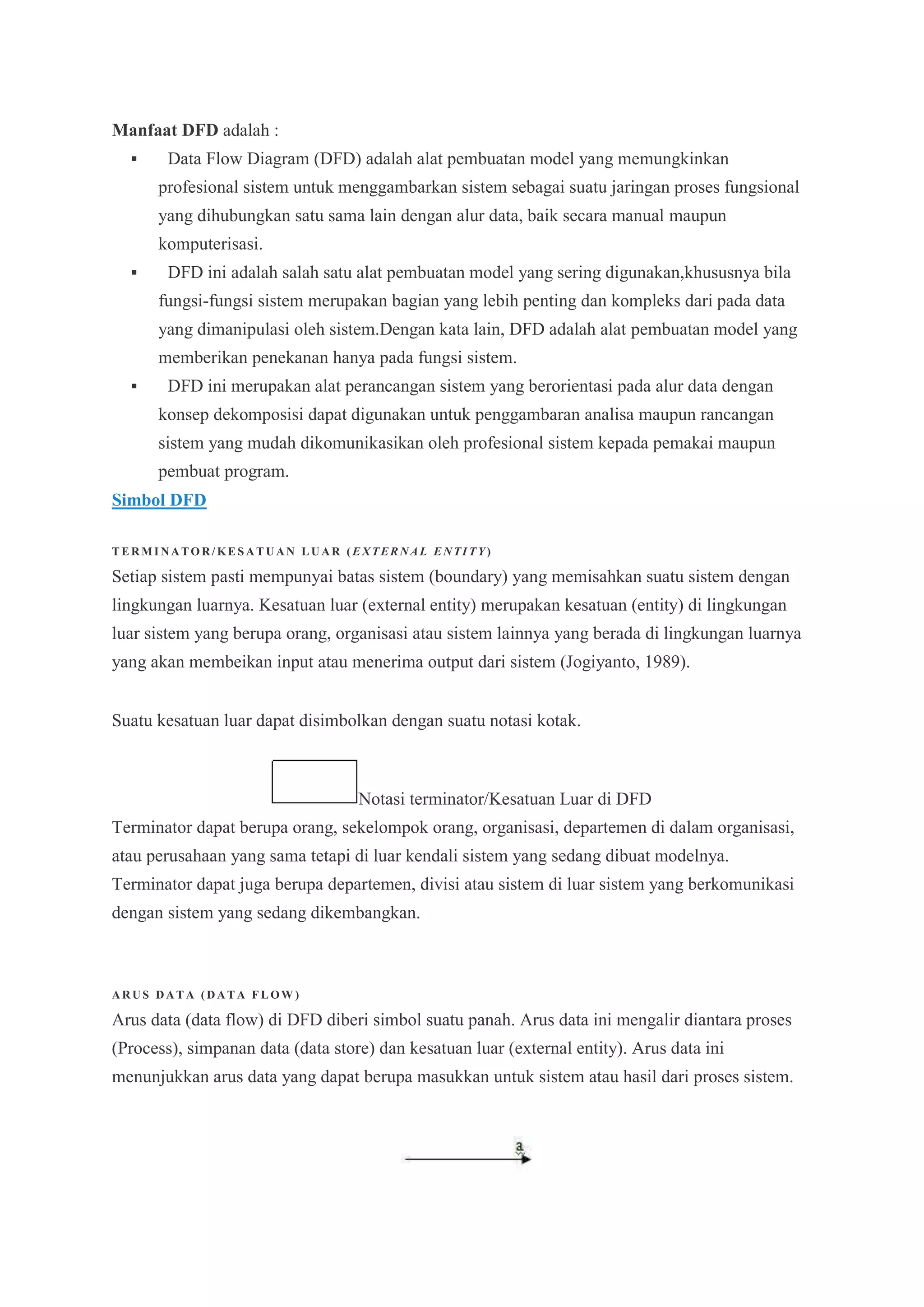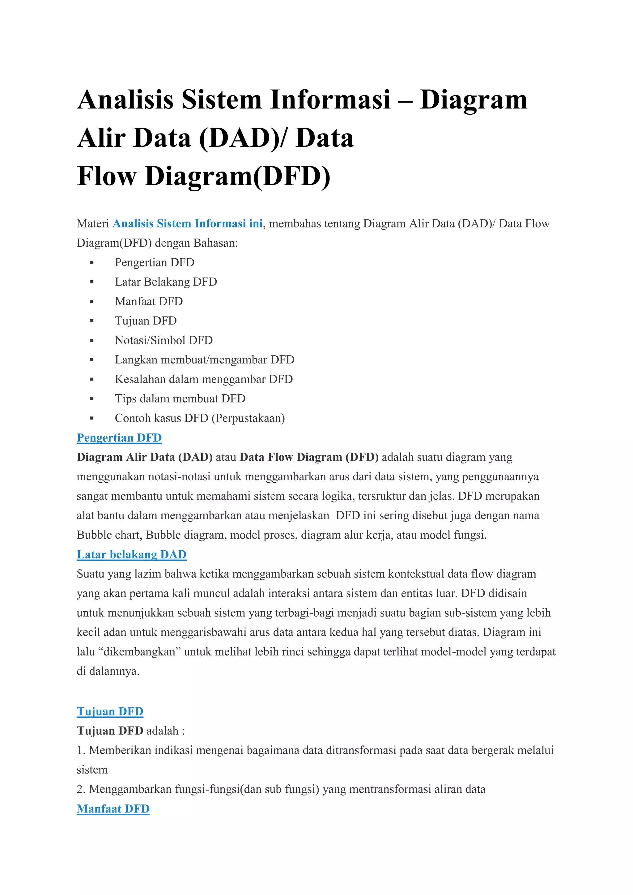 Dokumen ini membahas tentang Diagram Alir Data (DAD) atau Data Flow Diagram (DFD) yang digunakan untuk menggambarkan arus data dalam sistem secara logis dan struktural. DFD memberikan manfaat dalam perancangan sistem dengan menekankan fungsi-fungsi dan aliran data, serta menyediakan pedoman dan tips untuk membuat DFD yang efektif dan menghindari kesalahan umum. Langkah-langkah dalam menggambar DFD juga dijelaskan, dimulai dari identifikasi entitas luar hingga pembuatan diagram level yang lebih detil.