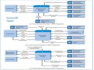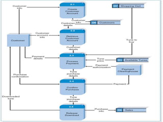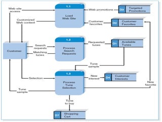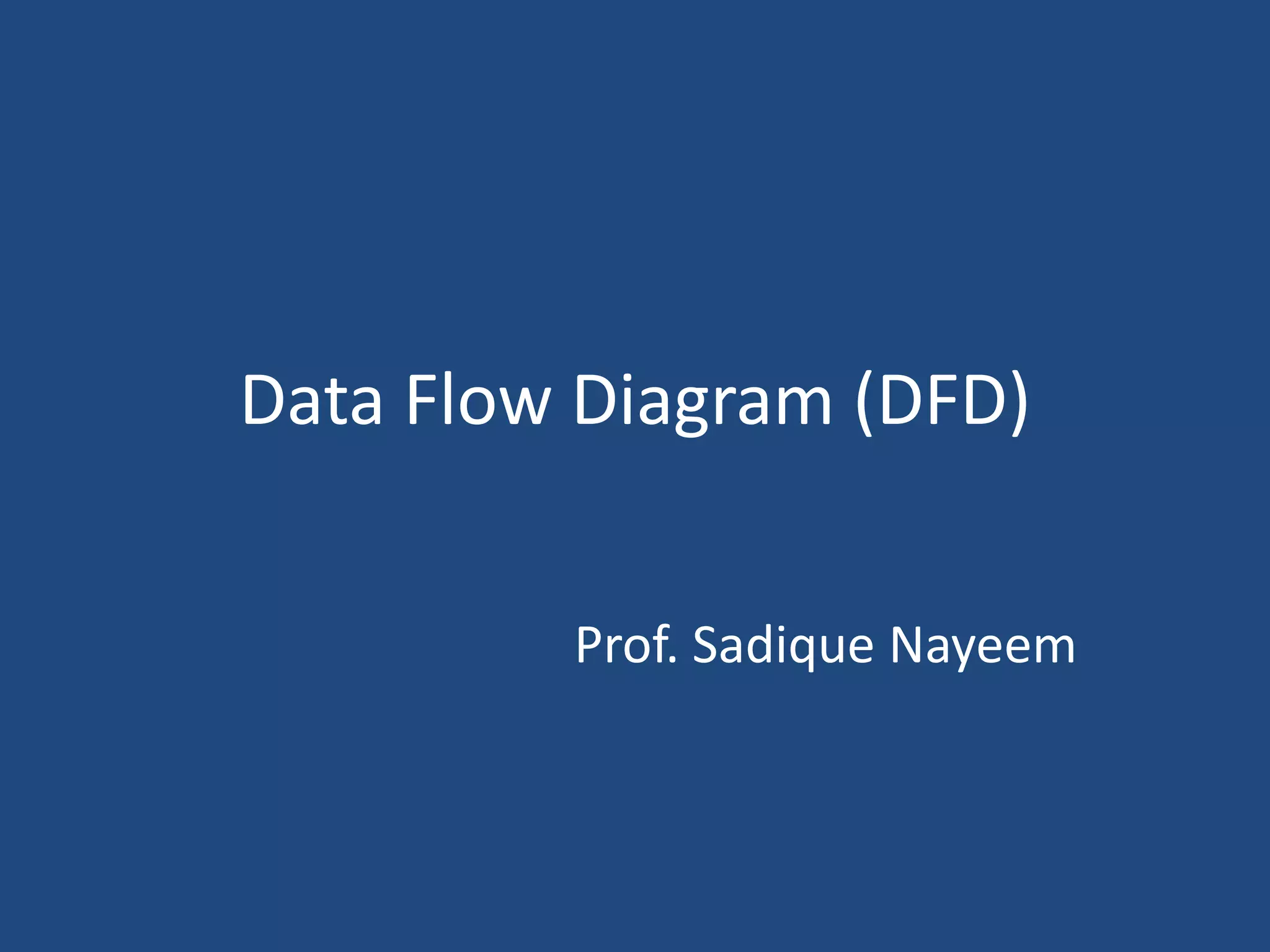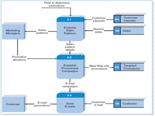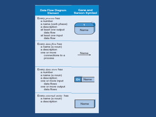 This document discusses data flow diagrams (DFDs) and their elements. It explains that a DFD visually shows how data moves through an information system by using graphical symbols like processes, data stores, external entities, and data flows. It provides examples of a context diagram showing one overall process and all external entities, as well as a level 0 diagram breaking that process into major sub-processes and showing data flows between them. The document also outlines how DFDs can be further decomposed into level 1, 2, and additional diagrams to show internal processes and data flows in more detail.
