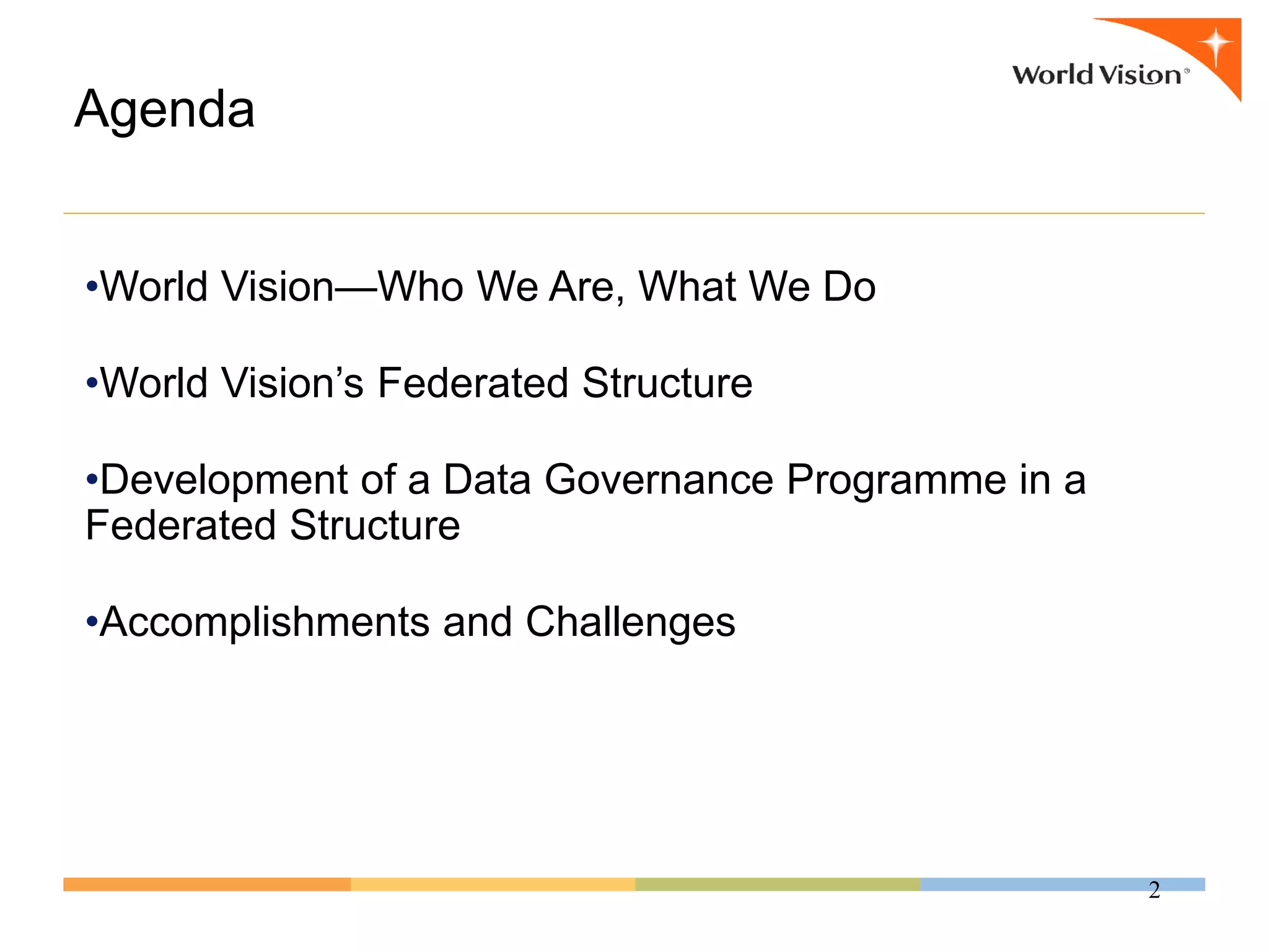 This document provides an overview of World Vision's development of a data governance program within its federated organizational structure. World Vision is a global Christian humanitarian organization made up of multiple independent national entities. It established a Data Governance Office in 2008 to help govern data across these entities. The office developed a strategy and roadmap but then faced budget cuts during the 2008 financial crisis. It focused on governing child sponsorship data by bringing records together and complying with EU privacy laws. This incremental approach helped the program survive and establish governance working groups and a council. Lessons included starting small and building value, having a clear plan, and gradually expanding the program's scope through proven results.