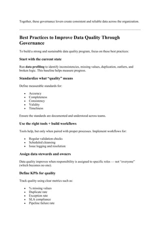 Governance assigns responsibility: data owners, stewards, and custodians. This ensures issues