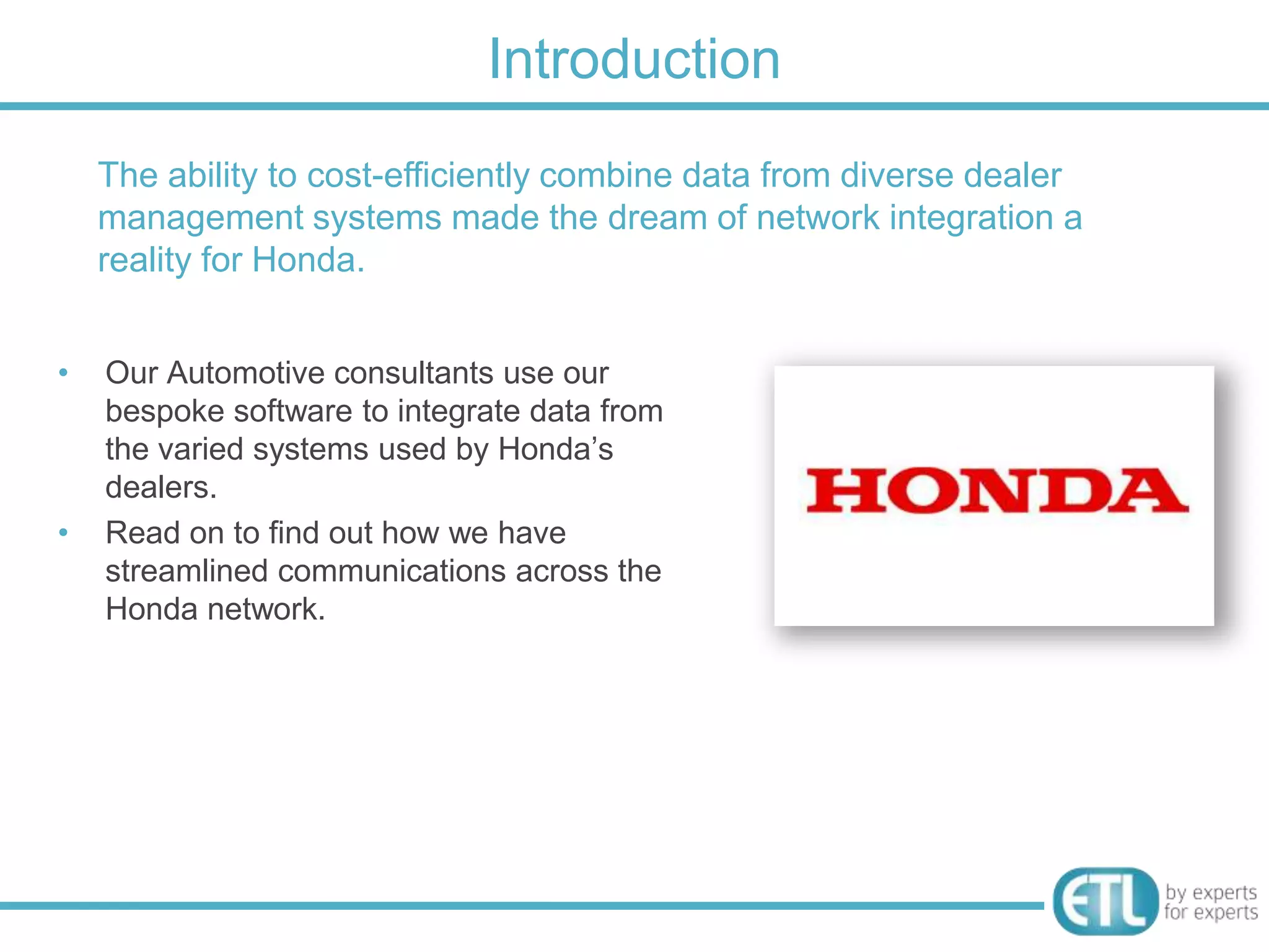 Honda UK Manufacturing faced communication challenges with its diverse dealer network, which utilized various dealer management systems (DMS). ETL Solutions was selected to integrate data through projects focused on service invoices and automatic parts replenishment, streamlining communication and improving efficiency. The integration has led to better communication, supply chain efficiency, and enhanced customer satisfaction within Honda's dealer network.