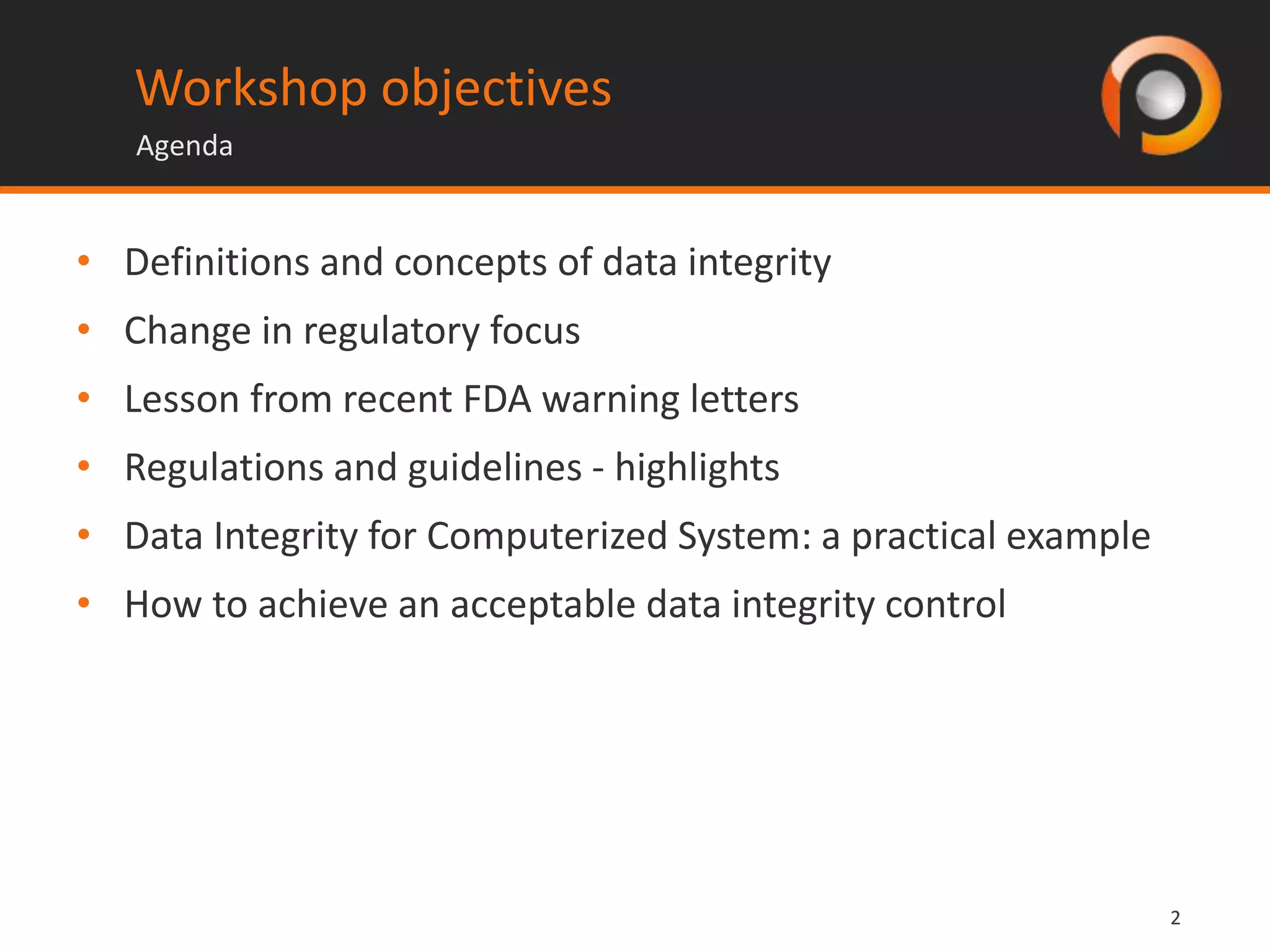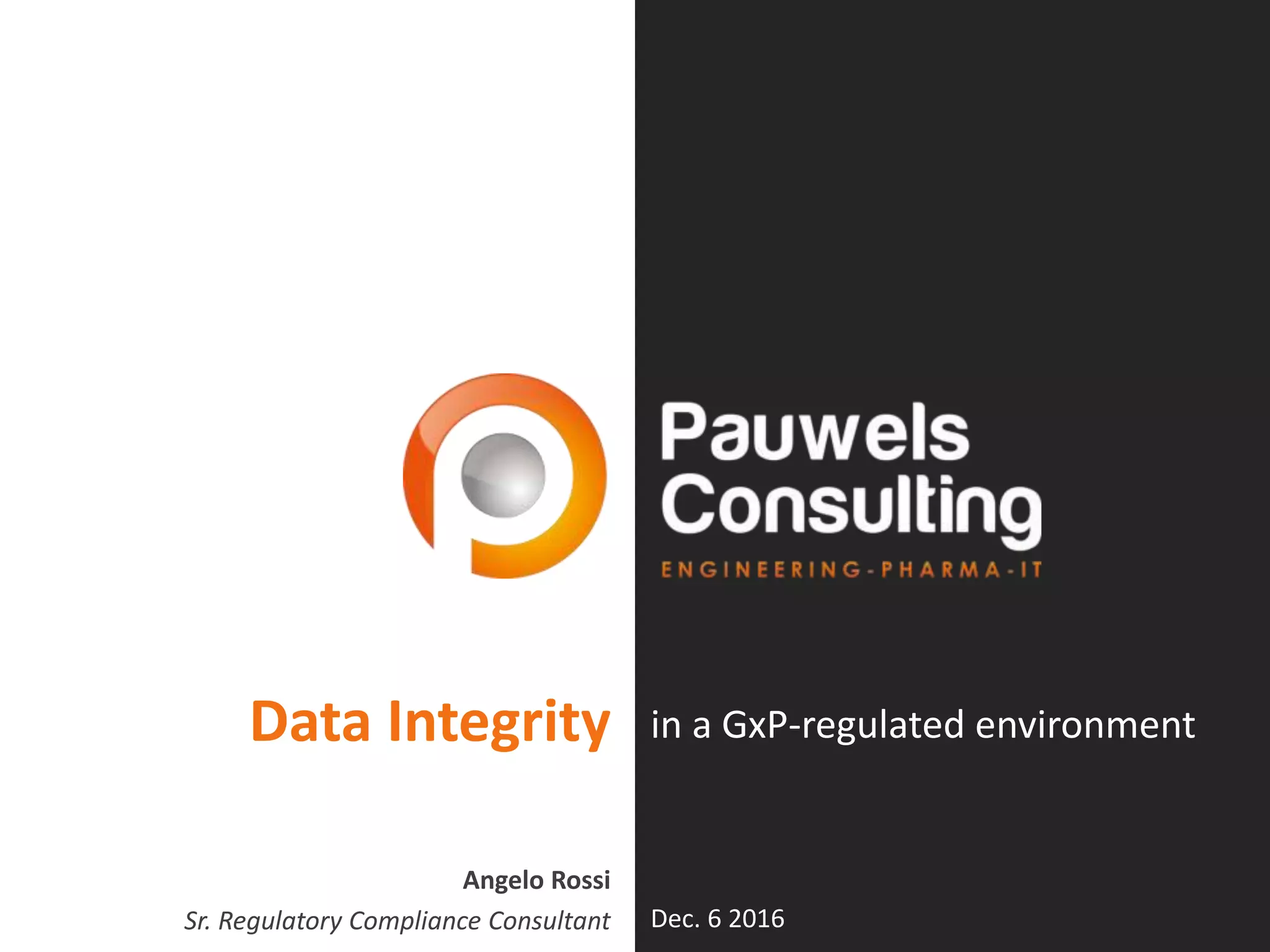The document discusses the importance of data integrity within GxP-regulated environments, highlighting the regulatory focus on maintaining accuracy and consistency of data throughout its lifecycle. It outlines recent trends in regulatory inspections, the consequences of data integrity failures, and provides guidance on compliance with specific regulations. Additionally, it emphasizes the need for robust data governance practices and examples of violations from various companies to illustrate common data integrity issues.