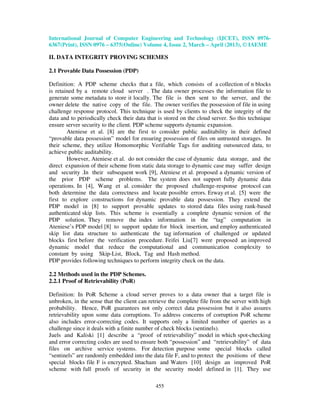 This document summarizes techniques for ensuring data integrity in cloud storage. It discusses Provable Data Possession (PDP) and Proof of Retrievability (PoR) as the two main schemes. PDP allows a client to check that a cloud server possesses their file correctly, while PoR guarantees file retrievability and addresses data corruption concerns using error correcting codes. The document also examines other methods like naive hashing, signature-based approaches, and their limitations regarding public auditing and dynamic operations. Overall, the document provides an overview of the key challenges and state-of-the-art solutions for verifying data integrity in cloud computing.