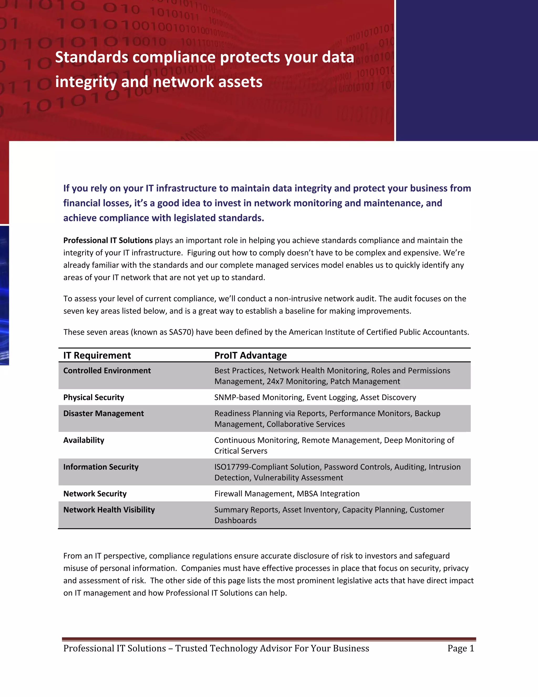 The document discusses the importance of standards compliance in maintaining data integrity and protecting network assets through effective IT infrastructure management. Professional IT Solutions can help businesses achieve compliance through network audits and managed services, focusing on key areas such as security, risk management, and monitoring. It also outlines several legislative acts impacting IT management and how they relate to ensuring security and privacy for businesses.