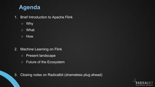The document presents an overview of Apache Flink, highlighting its advantages for data-intensive applications, particularly in machine learning. It discusses Flink’s capabilities, its ecosystem including FlinkML and other related frameworks, and Radicalbit's contributions to enhance these functionalities. The session concludes with an emphasis on the future potential of Flink for real-time applications and distributed learning.