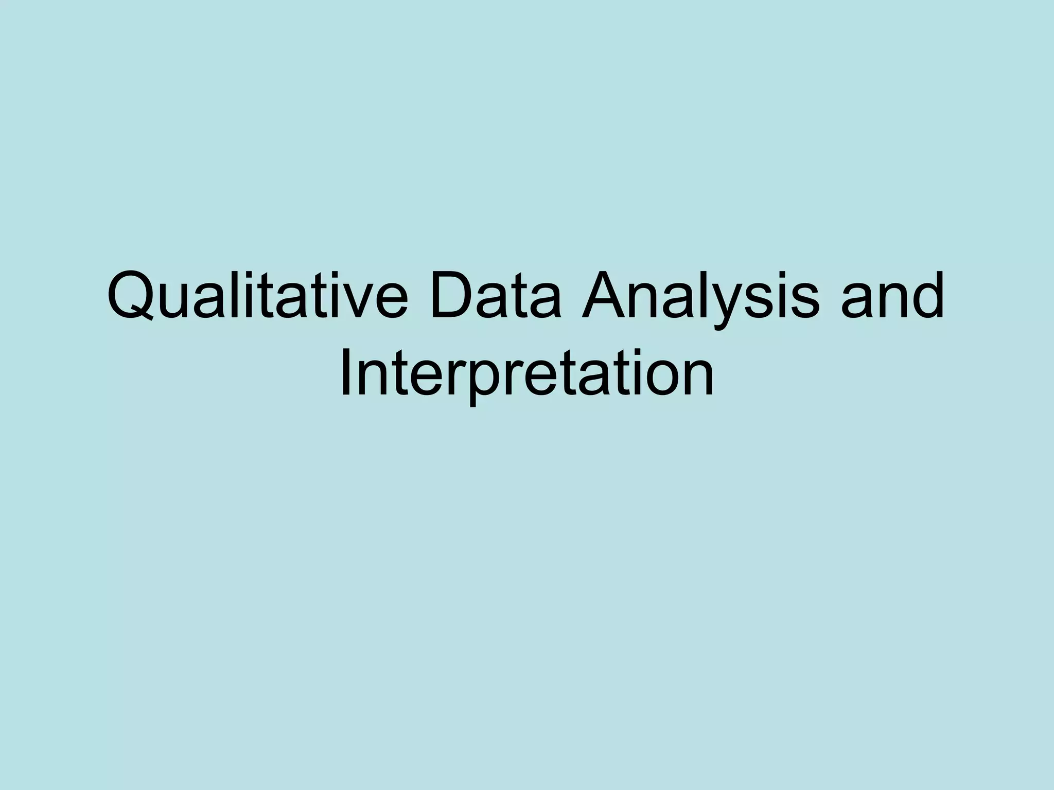 This document discusses qualitative data analysis and interpretation. It describes how analysis differs between quantitative and qualitative research traditions. It also discusses strategies for analyzing qualitative data, such as identifying themes, coding data, and concept mapping. The document outlines steps for data analysis during and after data collection. It emphasizes analyzing data iteratively and interpreting findings by answering questions about importance and meaning. Finally, it discusses ensuring credibility, mixed methods research, and evaluating mixed methods designs.