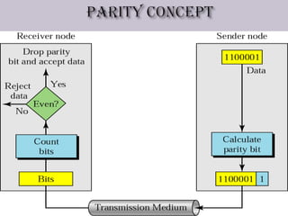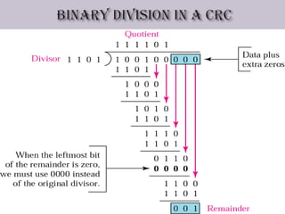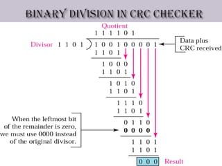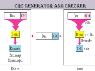 3. Error detection techniques like parity bits, checksums, and cyclic redundancy checks to detect errors in transmitted frames.