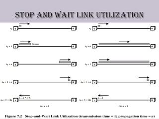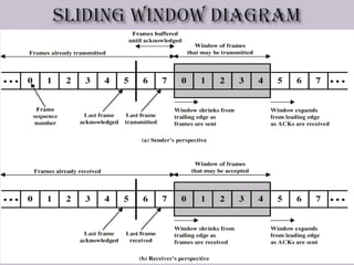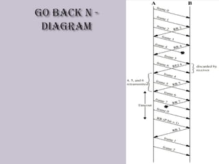 2. Common data link layer protocols like stop-and-wait and sliding window protocols using go-back-N and selective repeat to allow multiple frames to be transmitted.