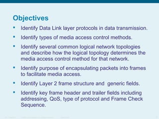 This document discusses the data link layer, which prepares network layer packets for transmission by encapsulating them into frames. It identifies common data link layer protocols for both LANs and WANs. The data link layer controls media access through logical link control and media access control sublayers. Media access control methods include controlled access like token ring and contention-based access like CSMA/CD. Frame structure is also discussed, with frames containing source/destination addresses, error checking fields, and encapsulated network layer data. Different frame types are used depending on the logical and physical network topology.