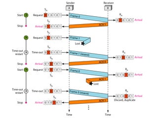 The document explains data transmission techniques such as byte and bit stuffing to manage data streams and prevent synchronization issues. It outlines the responsibilities of the data link layer, including flow control and error control through protocols like Stop-and-Wait ARQ and Sliding Window Protocol. Additionally, it discusses issues with noisy channels and the impact of round trip time on link utilization.