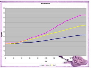 The document summarizes an experiment conducted by a group of students to determine the food energy obtained from different types of nuts (peanuts, cashew nuts, and almonds) through calorimetry. The experiment involved burning food samples and measuring the temperature change of the surrounding water using a data logger. The results showed that almonds produced the highest temperature change while peanuts produced the lowest, indicating that almonds provided the most energy and peanuts provided the least. Tables of temperature data recorded during the burning of each food sample are also presented in the document.