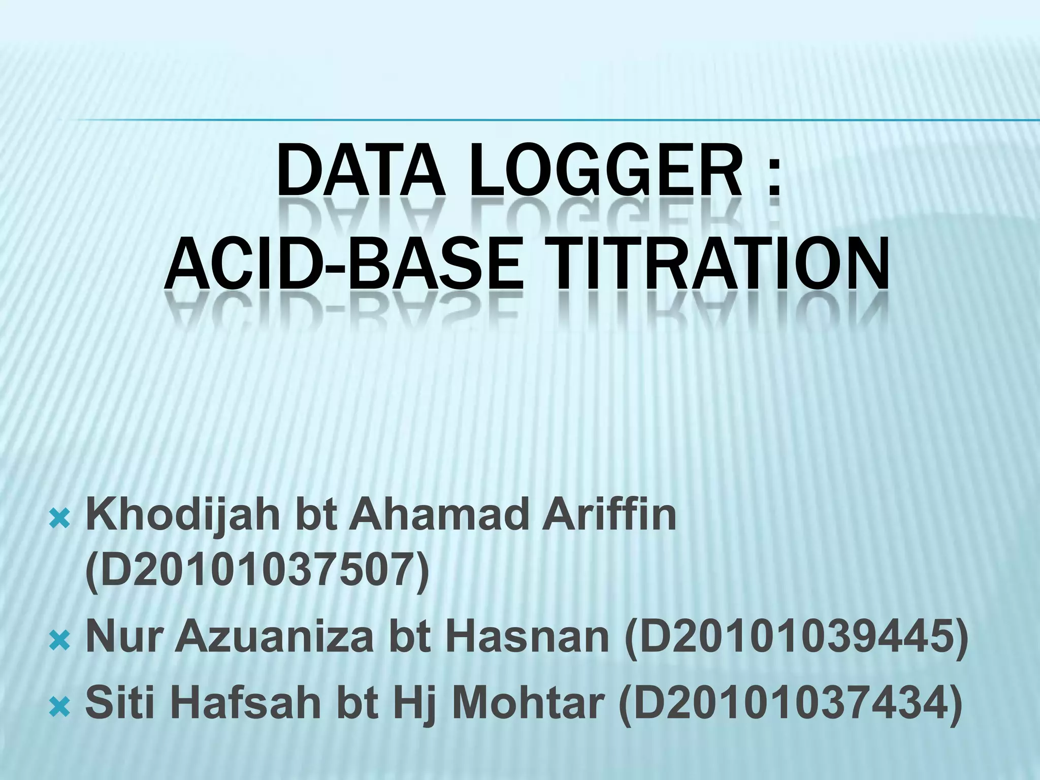 The document describes an experiment using a data logger to perform acid-base titrations. The objectives are to construct titration curves, learn principles of acid-base titrations using the data logger as an educational tool, and determine concentrations of analytes like acetic acid in vinegar and sodium bicarbonate in baking powder. The procedure involves titrating samples like HCl, NaOH, baking powder, and vinegar against each other to generate titration curves and determine concentrations. The results show various titration curves. Maintaining acid-base balance through systems like buffering and respiration is important for health.