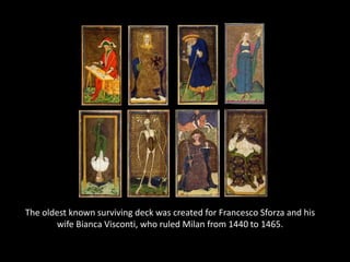 The document summarizes the history and evolution of Tarot cards from their origins in 15th century Italy to their modern occult symbolism. It discusses how Antoine Court de Gébelin mistakenly linked the cards to ancient Egyptian wisdom in 1775. Éliphas Lévi further developed occult symbolism in the 1850s by connecting the major arcana to the Hebrew alphabet and Kabbalah. The Hermetic Order of the Golden Dawn in 1888 used Tarot in rituals for spiritual rebirth through creative visualization. Arthur Edward Waite and Pamela Coleman Smith produced a popular deck in 1909 while Aleister Crowley and Lady Frieda Harris created an occult-focused deck in 1938-1943.